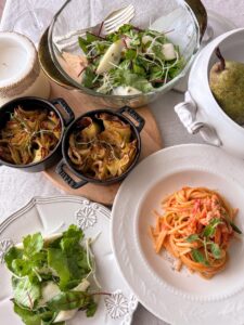 今月の後半B: おうち洋食![]() ![]() ・ボロネーゼポテトグラタン ・トレビスキャベツのホットサラダ サーモンがけ ・林檎のコンフィチュールバケット ・洋梨のハニーミントマリネ オーブンを使ったおうち洋食、みんなでワイワイおもてなしにもご利用を! 野菜と肉の旨味で作るボロネーゼ、軽いマッシュポテトと合わせグラタン風に仕上げます 寒い時期ならではのオーブン料理お楽しみください 📖ボロネーゼの旨味の出し方、じゃがいもの扱い、グラタンの仕上げ方 ホットサラダは野菜をたっぷりといただけます、トレビスの苦味とサーモンを組み合わせて 📖トレビスキャベツの下準備、マヨソースの作り方、仕上げ方 林檎の甘さを活かしたコンフィチュールは赤ワインのコクをプラスして 📖林檎のコンフィチュールの作り方、バケットの扱い、仕上げ方 香り豊かな洋梨はフレッシュとハニーピュレをシンプルに楽しんで 📖洋梨の扱い、仕上げ方 | |