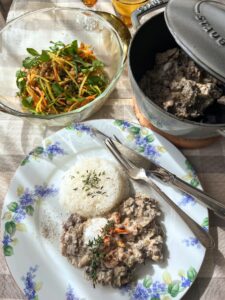 今月のB 春のお楽しみランチ ![]() ![]() ・春のホワイトビーフストロガノフ ・新人参と大麦・豆のサラダ ・苺の米粉ブラウニー ビーフストロガノフは通常ブラウンソースが使われますが、ロシアではサワークリームが主体のホワイトが多いとか、、薄切り肉で手早く 薄切り肉を使い煮込み時間も手早く、サワークリームの代用でヨーグルトで軽やかに、そしてさっぱりアイテムをもう一つ忍ばせて仕上げます 📖ストロガノフとは、ホワイトストロガノフの作り方仕上げ方、サワークリームの代用、チキンスープライスの作り方、プラスアイテムの作り方 みずみずしい新人参はやはり生で、切り方を変えて表情を出し、大麦やレンズ豆を合わせます。 📖食材の切り方、ドレッシングの作り方、仕上げ方 ブラウニーは重ためなケーキのひとつですが、軽やか仕上げにアレンジします。バターは半分、米粉使用、チョコレートはそのままで美味しさ確保 📖ブラウニーの作り方、アレンジポイント、苺ソースの作り方、仕上げ方 | |